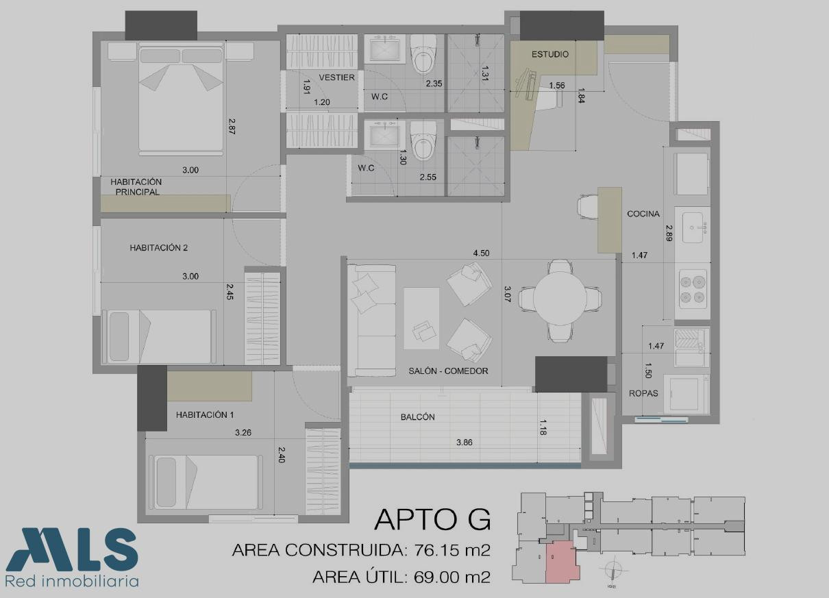 Disfruta de un apartamento tranquilo, fresco, rodeado de arboles y parques lineales; con un diseño que brinda iluminación ventilación natural y mayor independencia. Amplios espacios, ya que cuenta con 76.15 m2 y excelente distribución, 3 habitaciones, la principal con baño, vestier, las demás con espacio para closet, 1 baño adicional, estudio, salón comedor, Balcón, cocina abierta y zona de ropas independiente. Cuenta además con parqueadero cubierto. Unidad con piscina climatizada para adultos y niños, sauna, turco, gimnasio cubierto y externo, cancha polideportiva, salón de juegos, juegos infantiles, salón social, coworking, zona de mascotas, parqueadero de visitantes y portería 24h. Ubicación estratégica, cerca a centros comerciales, bancos, supermercados, colegios; fáciles vías de acceso y transporte público. Entrega inmediata en obra gris