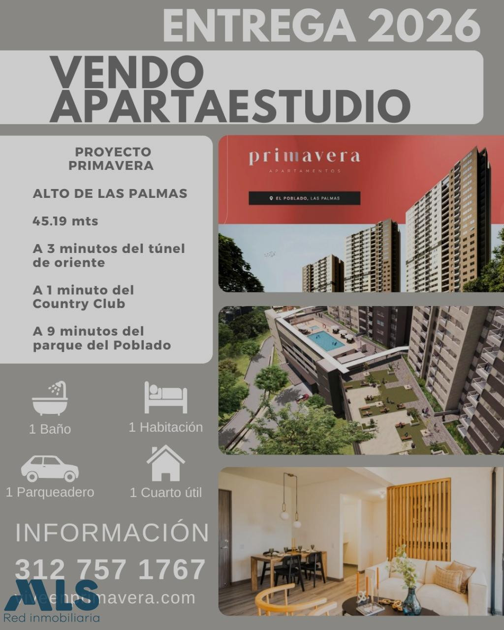 Apartaestudio de 45 m², con 1 habitación y 1 baño, que incluye parqueadero y cuarto útil. Ubicado estratégicamente a solo 3 minutos del Túnel de Oriente y 9 minutos del Parque de El Poblado, con excelente conectividad y alta valorización. La unidad residencial es muy completa y ofrece: • Lobby • Piscina para adultos y niños • Gimnasio • Salón de yoga • Turco y sauna • Juegos infantiles • Zona de mascotas Entrega , segundo semestre de 2026 Una excelente oportunidad para vivir o invertir