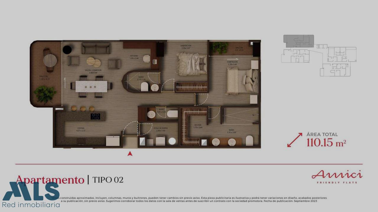 Ubicado en la Loma Lalinde, en el exclusivo sector de El Poblado, Amici es un proyecto ideal para quienes disfrutan lo mejor que ofrece Medellín: una vida social activa, un entorno cosmopolita y la cercanía a supermercados, bares, teatros y múltiples servicios. Todo esto en un ambiente que privilegia la privacidad y el bienestar. El proyecto está conformado por 67 apartamentos exclusivos con un diseño contemporáneo y espacios pensados para vivir y compartir grandes momentos, reflejando un espíritu joven donde la cercanía, la amistad y el estilo se integran de manera natural. Cada detalle ha sido concebido para ofrecer confort, funcionalidad y una experiencia de vida urbana sofisticada. El apartamento 1103 cuenta con dos habitaciones, cada una con baño independiente, la principal con balcón, sala y comedor integrados, cocina abierta, baño social, parqueadero doble y cuarto útil, además de un agradable balcón con vista garantizada hacia el norte de la ciudad que se convierte en uno de sus mayores atributos. Amici ofrece completas zonas comunes que incluyen gimnasio, piscina, solárium, coworking, salón social, social kitchen, juegos infantiles, zona de mascotas, parqueaderos, espacios diseñados para disfrutar, trabajar y relajarse sin salir de casa. La entrega de este inmueble está prevista para Mayo de 2026, convirtiéndose en una excelente opción para vivir o invertir en uno de los sectores más atractivos de Medellín.